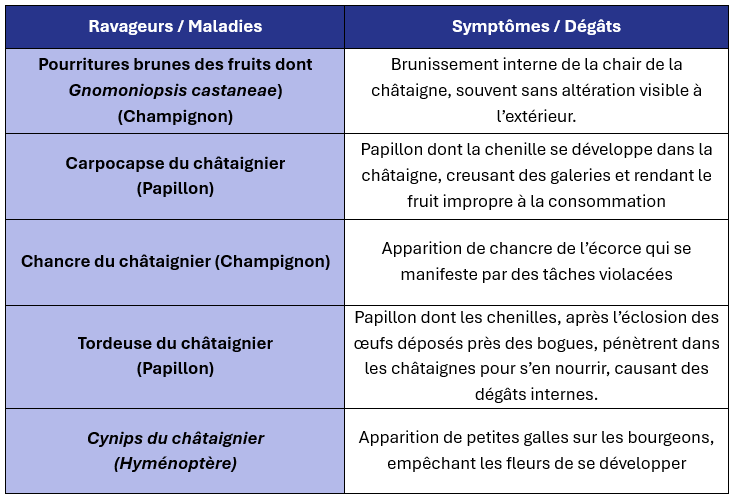 Le cynips du châtaignier est un insecte hyménoptère de la taille d’une guêpe. Ses oeufs sont déposés dans les bourgeons du châtaignier entre fin juin et mi-juillet. La larve passe ensuite l’hiver dans une galle, dont l’observation est le meilleur critère de diagnostic de la présence du cynips. Celle-ci mesure entre 5 à 20 mm, de couleur verte, parfois teintées de rose et se trouve sur les jeunes pousses. Quand les galles se forment sur la bogue, les châtaignes sont déformées. Selon le niveau d’infestation, on peut observer une perte de vigueur de l’arbre, une baisse de 60 à 80% de la production fruitière, la mortalité des rameaux touchés, des branches voire des arbres lors d’attaques importantes.